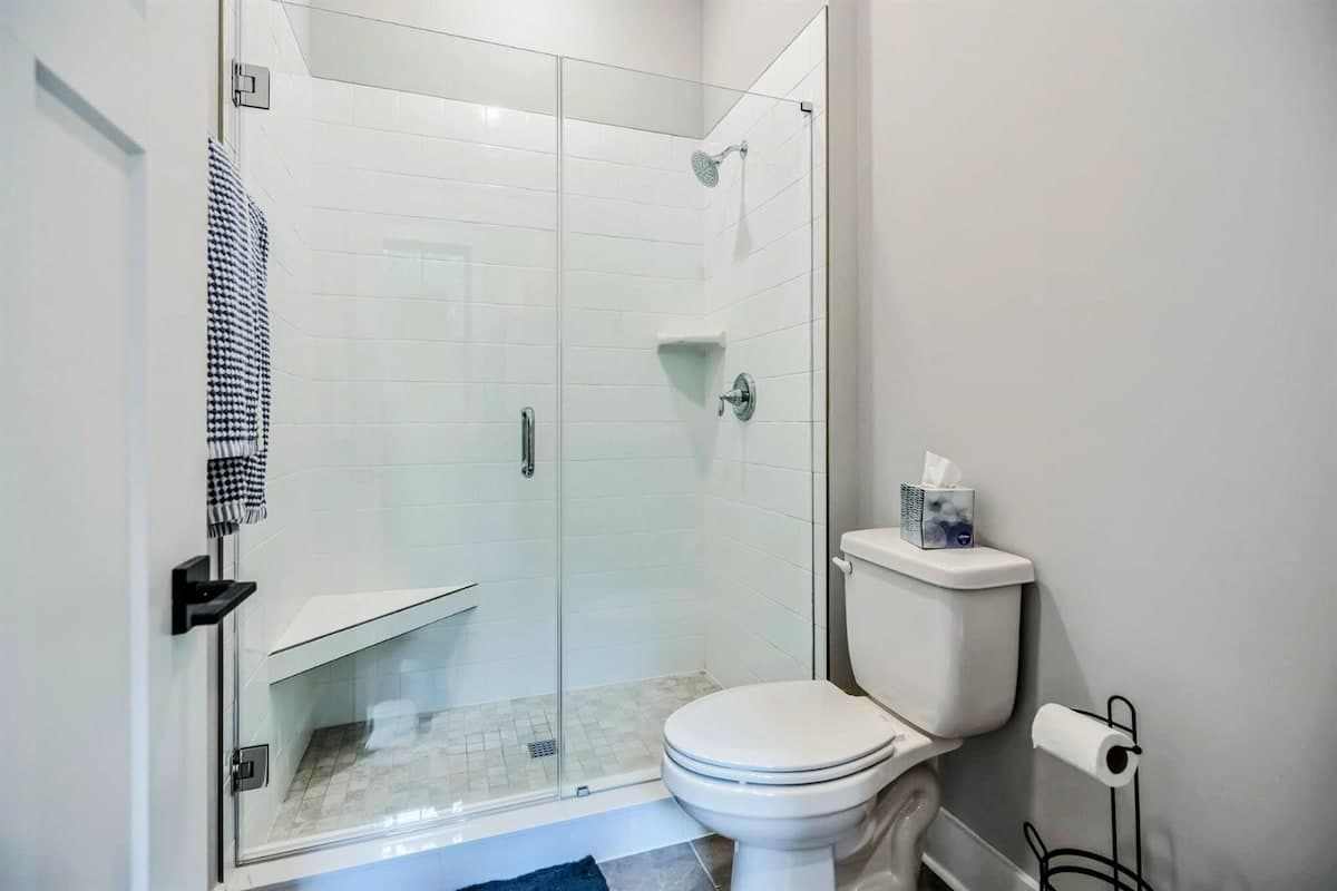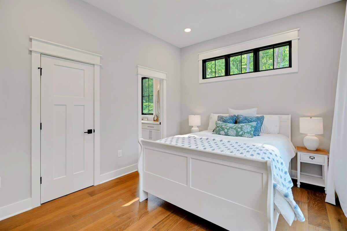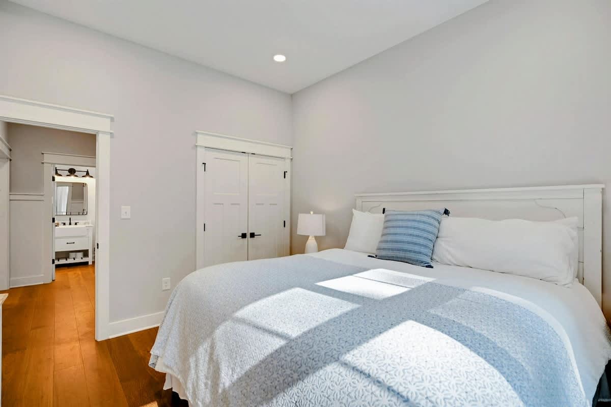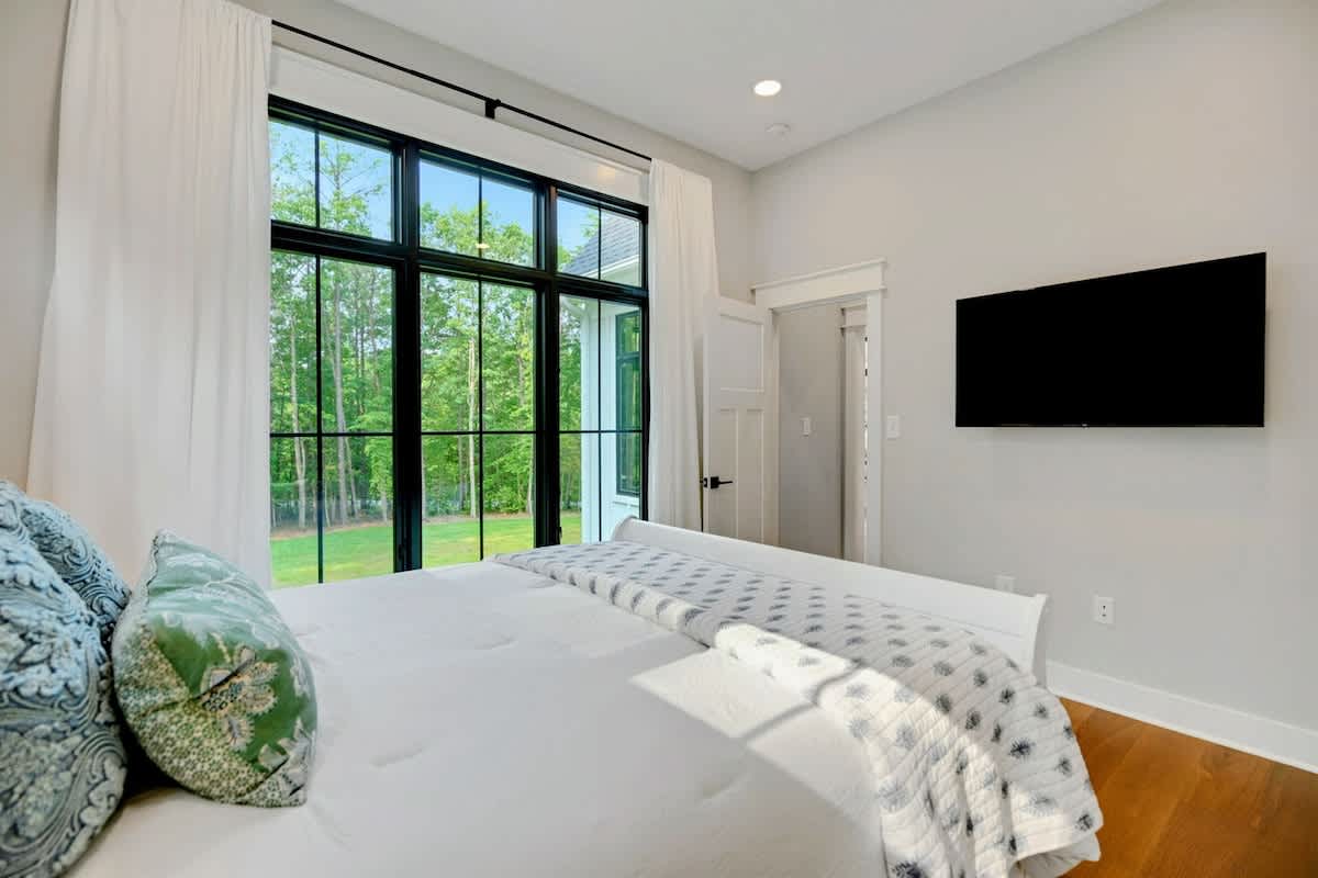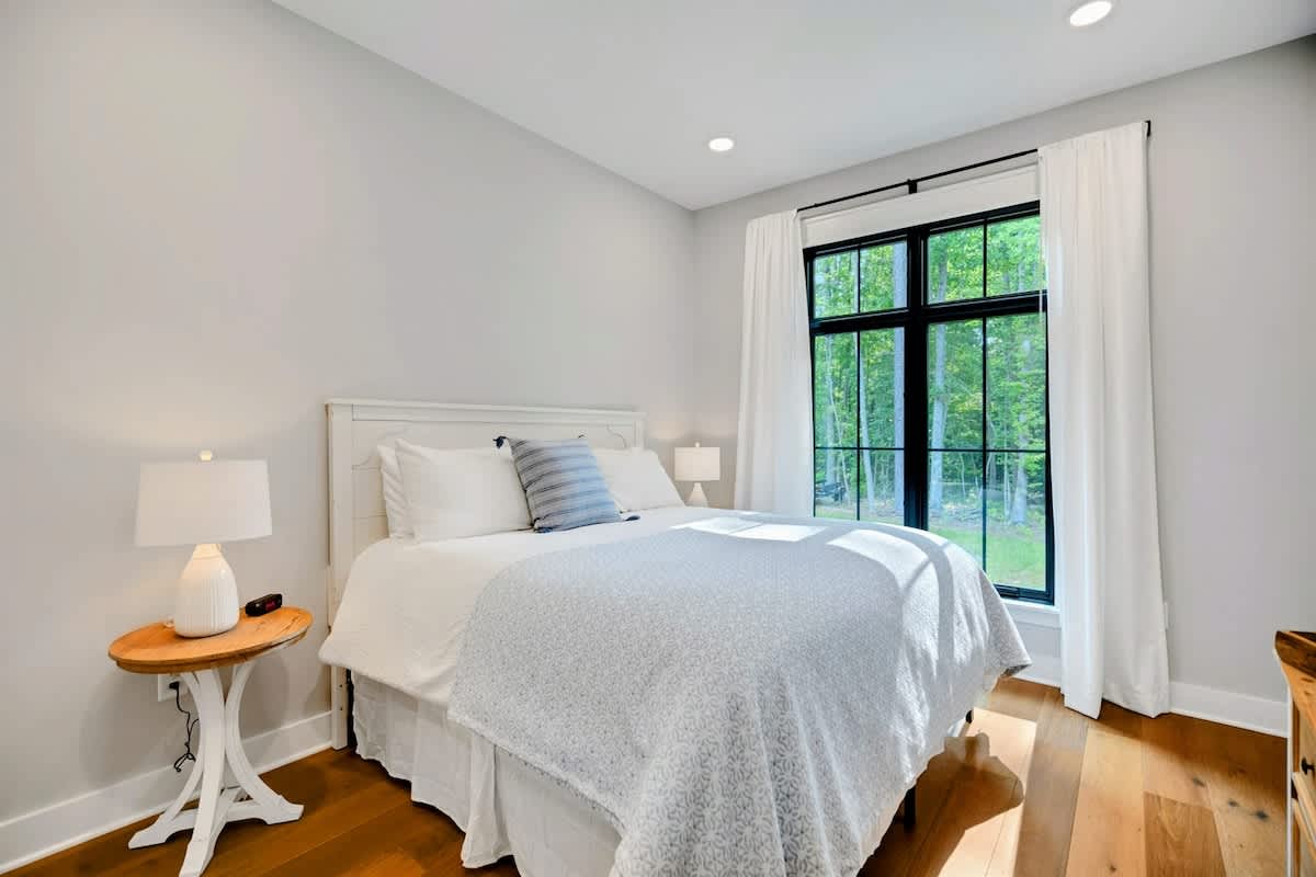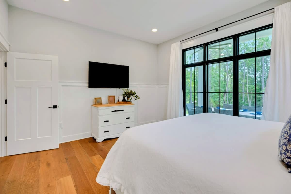 Owl's Nest has a total of 4 bedrooms all with flat screen tv's., one Primary Suite on the main level and then another king room and queen room that both share a Jack and Jill full bath. All bedrooms have brand new furniture and mattresses/bedding. The Primary Suite has a king bed with luxury bedding. Guests will enjoy the crisp white furniture, large flat screen TV, shiplap details in the Primary Suite, walk-in closet and huge Primary Suite Bath with a soaking tub, double vanity, quartz counters and windows everywhere. Fun fact: Our Primary Suite Bath won the builders award in 2023 for Best Suite! It is truly a luxury oasis!
