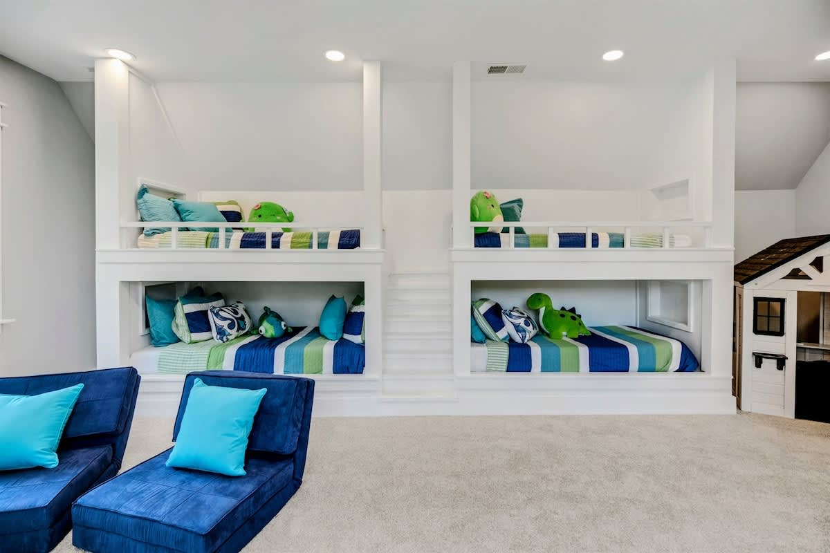 The upper level has the cutest quad bunk room/playroom you've ever seen, truly Pinterest worthy! The bunk room is a kids paradise, full stocked with a white wood playhouse, play kitchen, kids play table/chairs, and a flat screen TV with flip chairs. The bunk room has its own full bath. Kids will never want to leave!