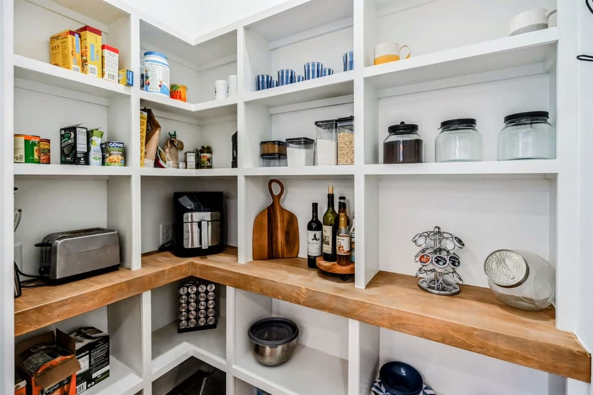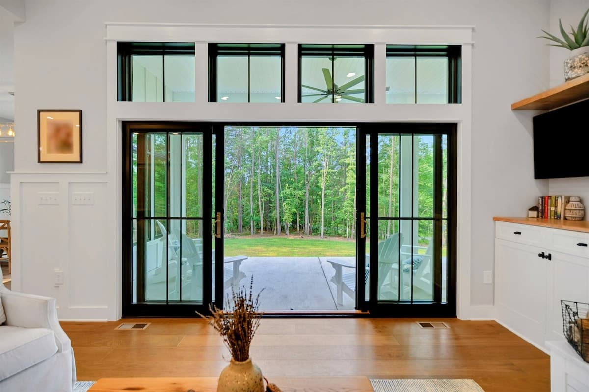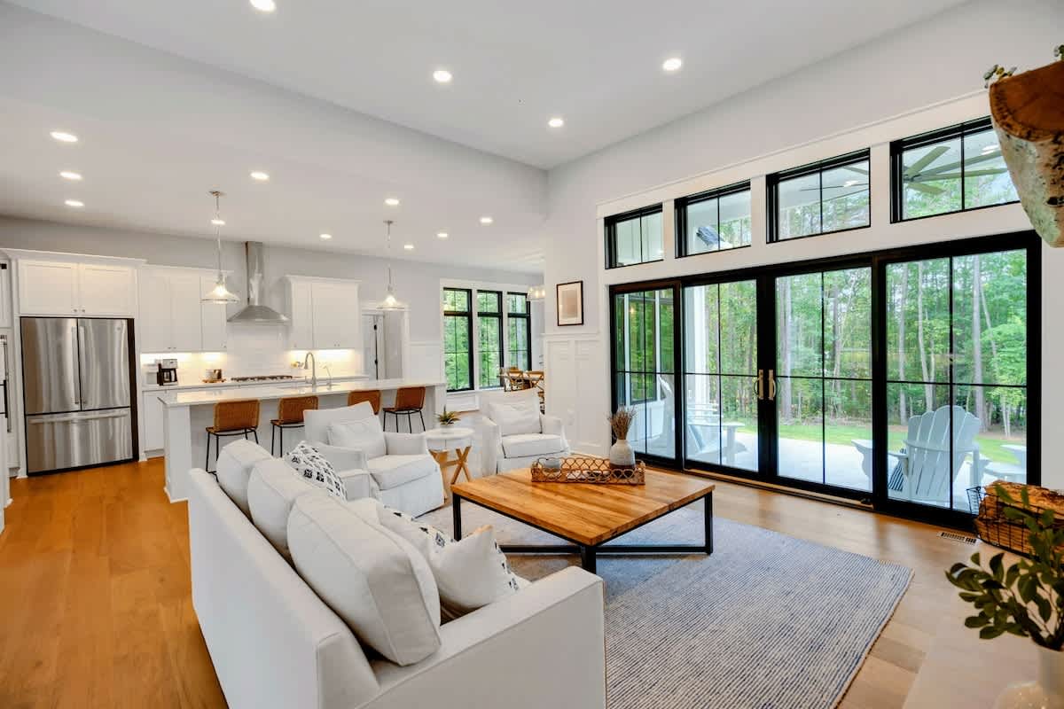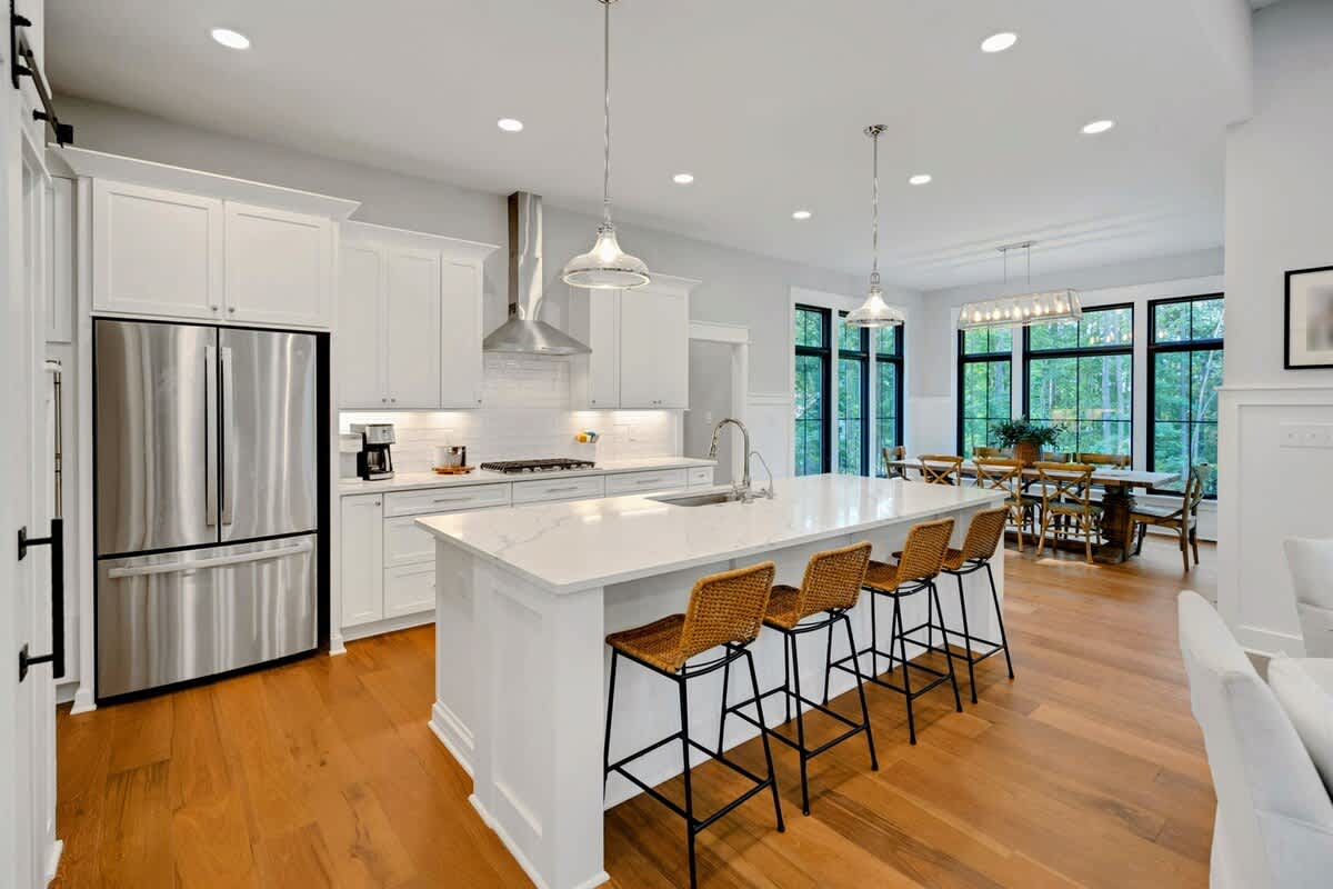 The open concept floor plan of Owls Nest really lends itself to entertaining and relaxing with family and friends. The great room, kitchen and dining area is surrounded by 12 foot ceilings and huge transomed black windows all around, which brings the outdoors in! The great room has a huge white shiplap fireplace with custom cabinetry, hardwood flooring and sliders opening to the patio, hot-tub, grilling and fire-pit area. The kitchen has high-end stainless appliances, white quartz counters, a walk-in pantry and a breakfast/dining room with a huge Restoration Hardware country dining table, surrounded by windows. This gourmet kitchen comes fully stocked!