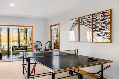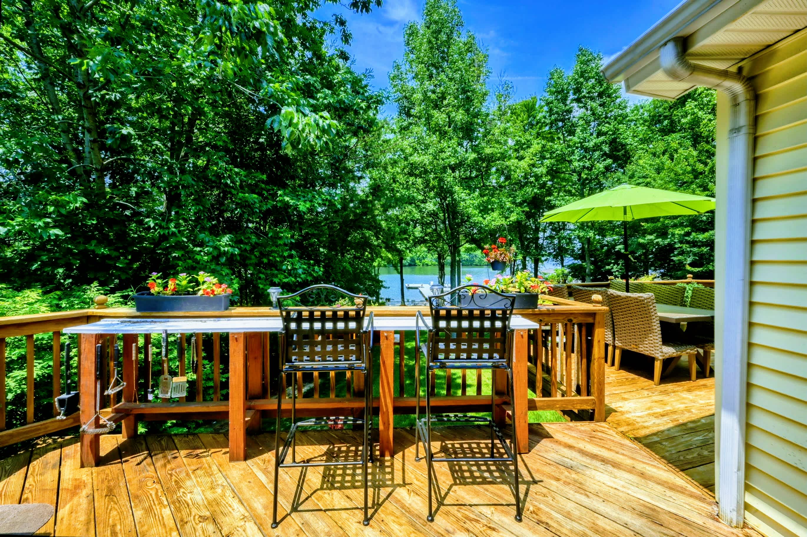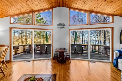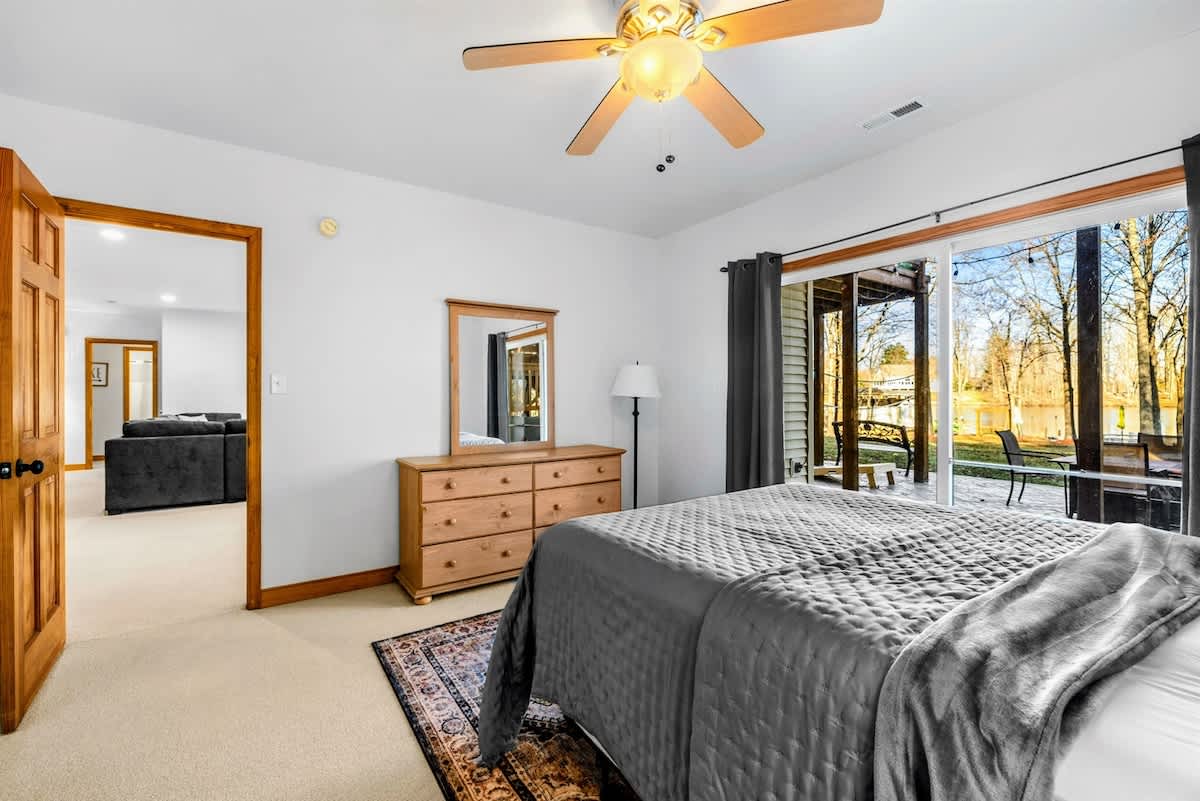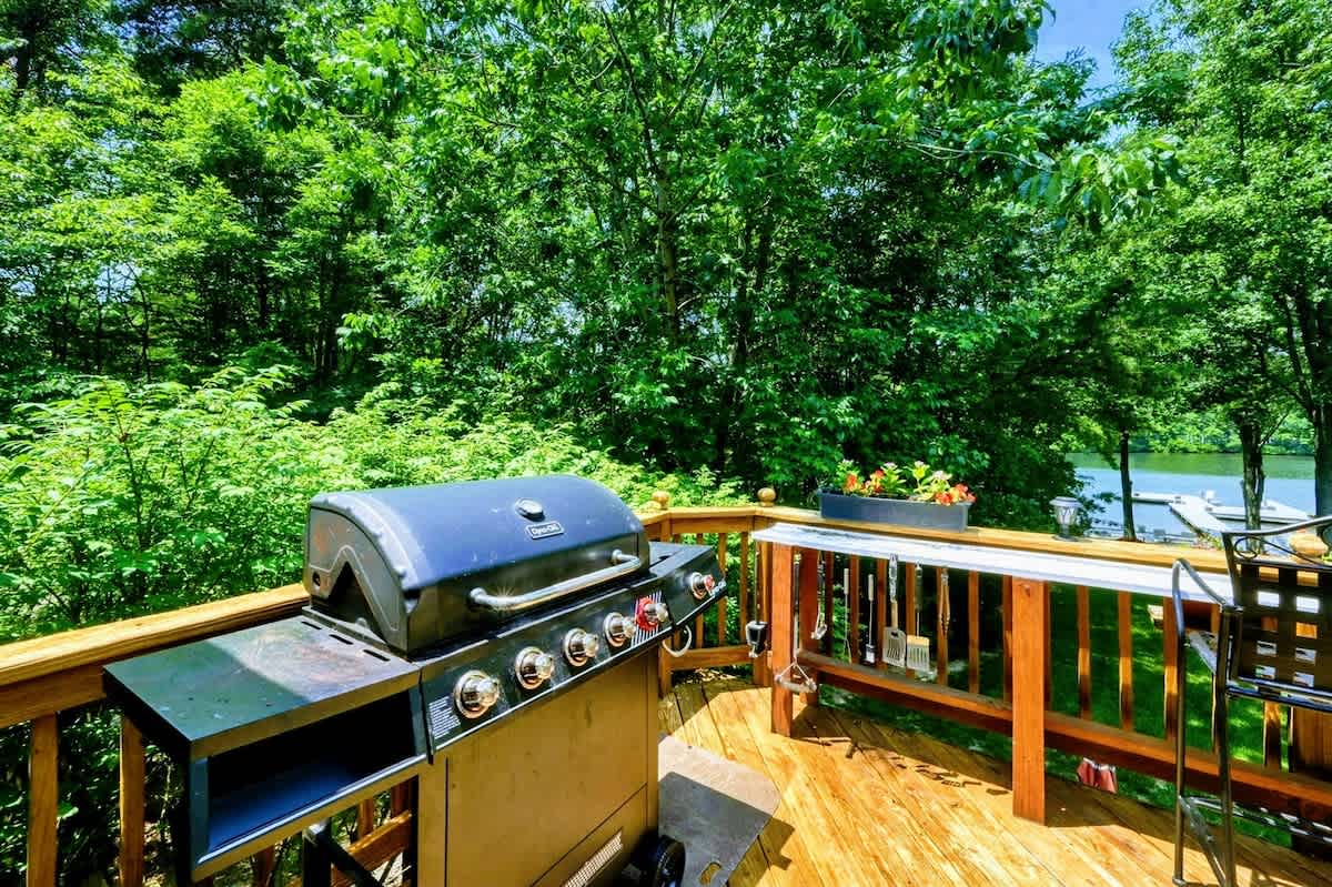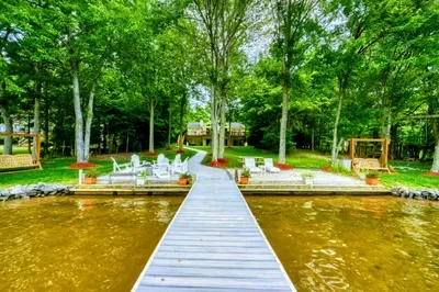 Outdoors, enjoy a large lakefront deck, private sandy beach, and a composite dock with deep water access. Gather around the lakeside firepit for evening s’mores, or play a game of cornhole, volleyball or horseshoes on the flat, grassy 1-acre lot.