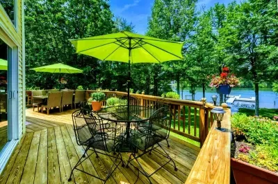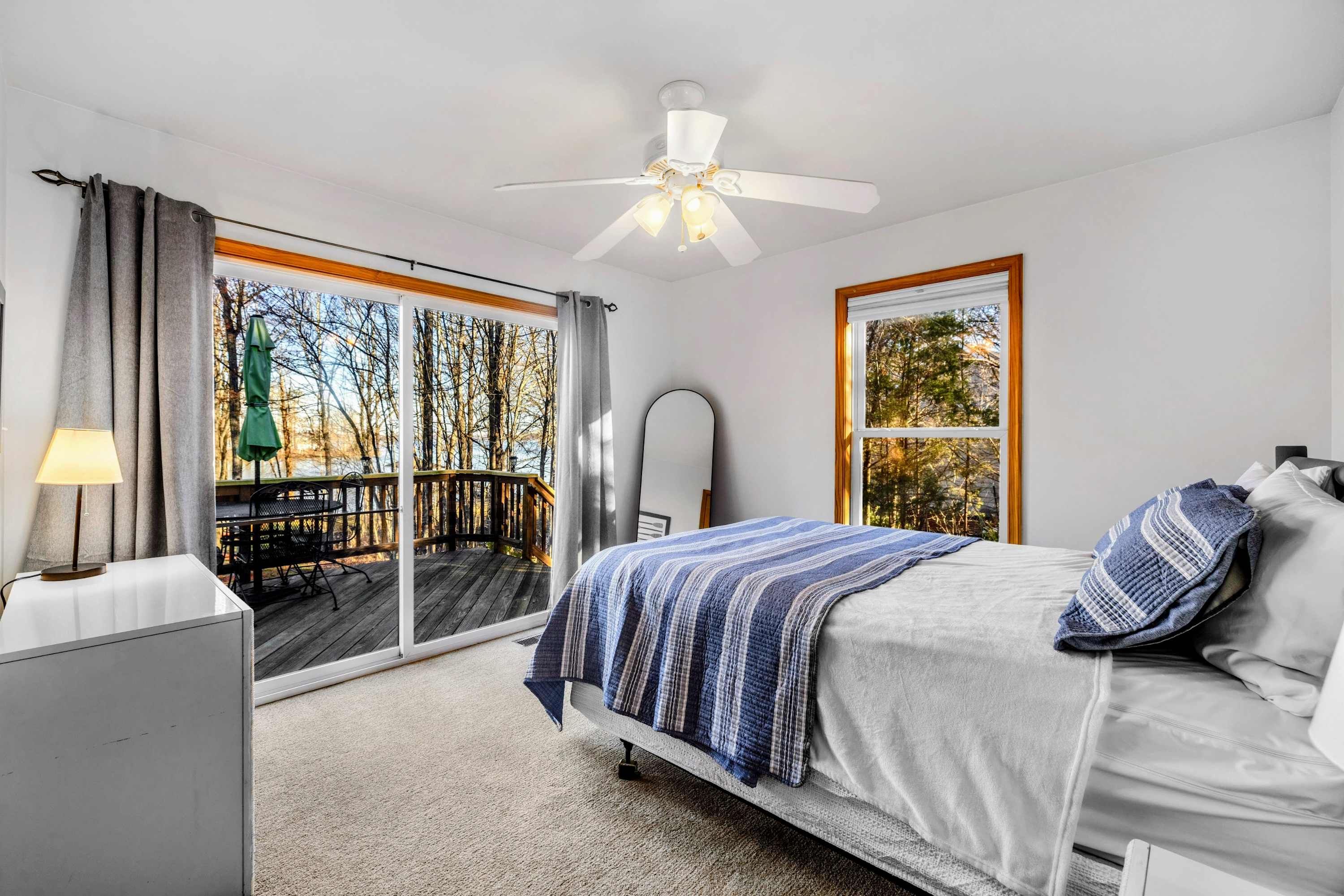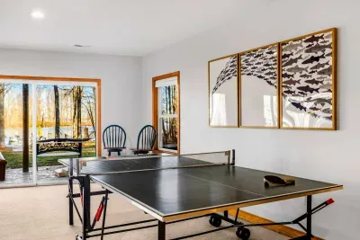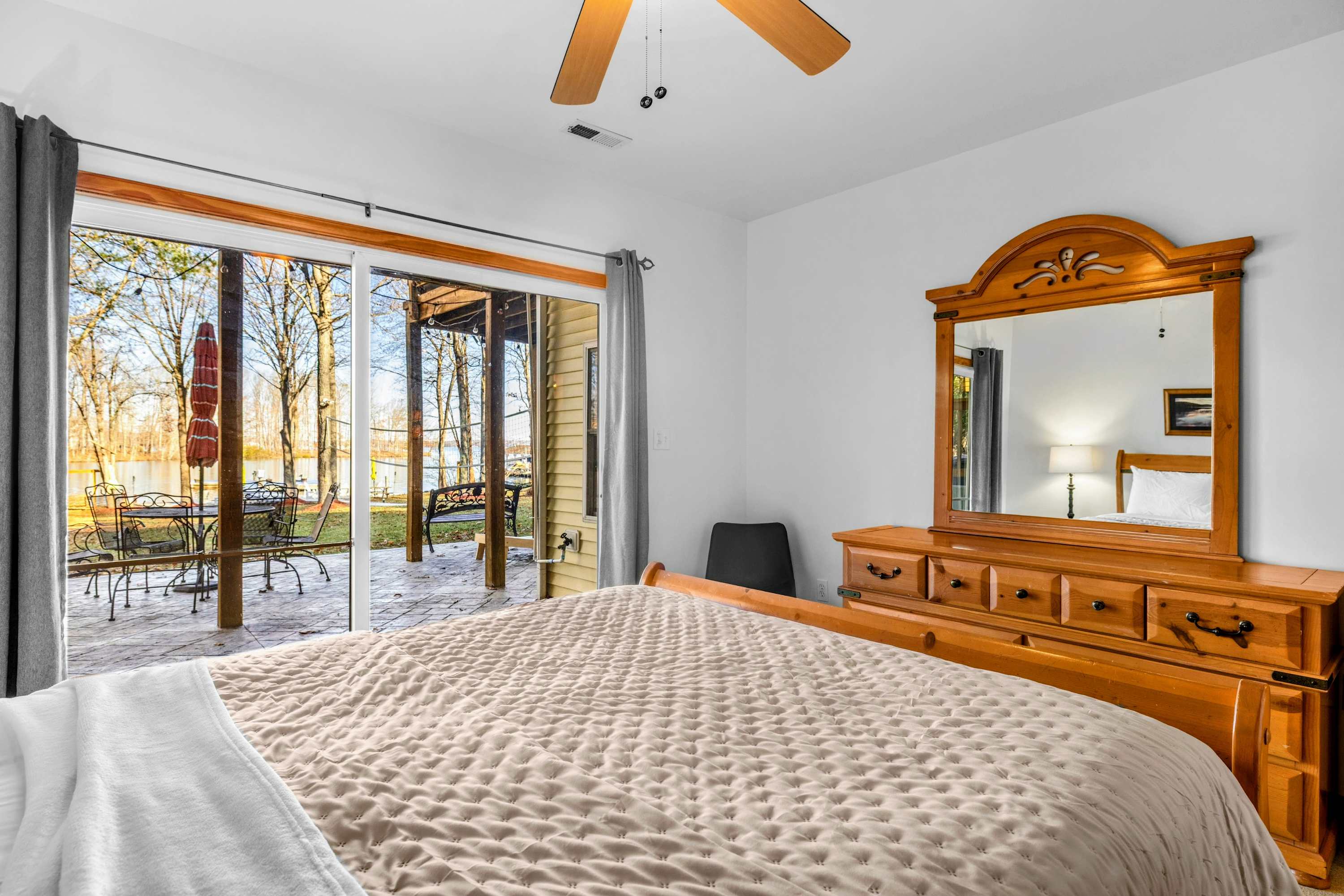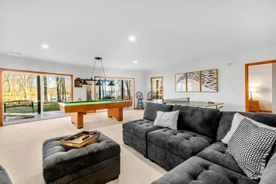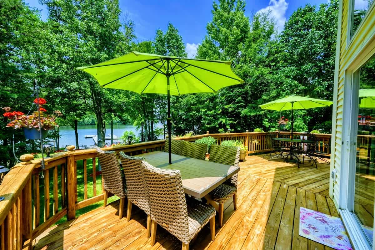 Outdoors, enjoy a large lakefront deck, private sandy beach, and a composite dock with deep water access. Gather around the lakeside firepit for evening s’mores, or play a game of cornhole, volleyball or horseshoes on the flat, grassy 1-acre lot.