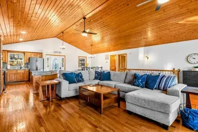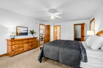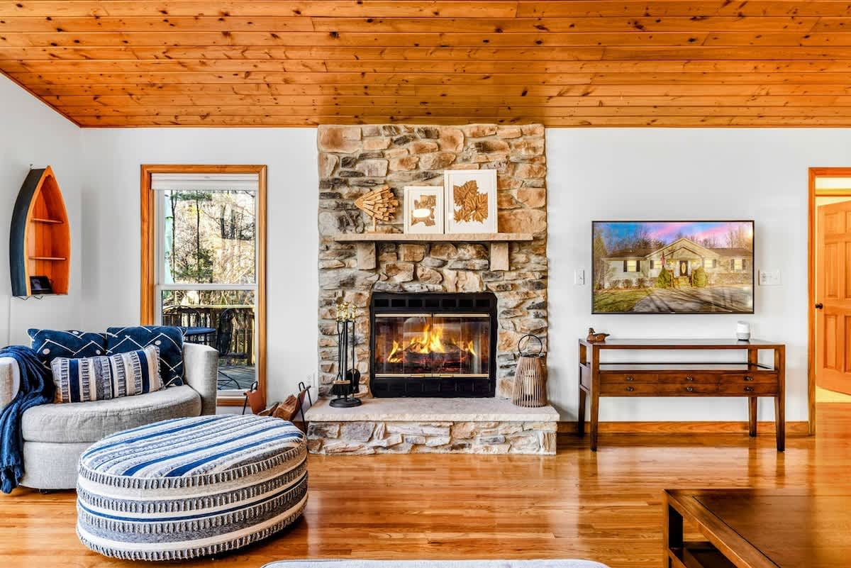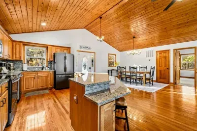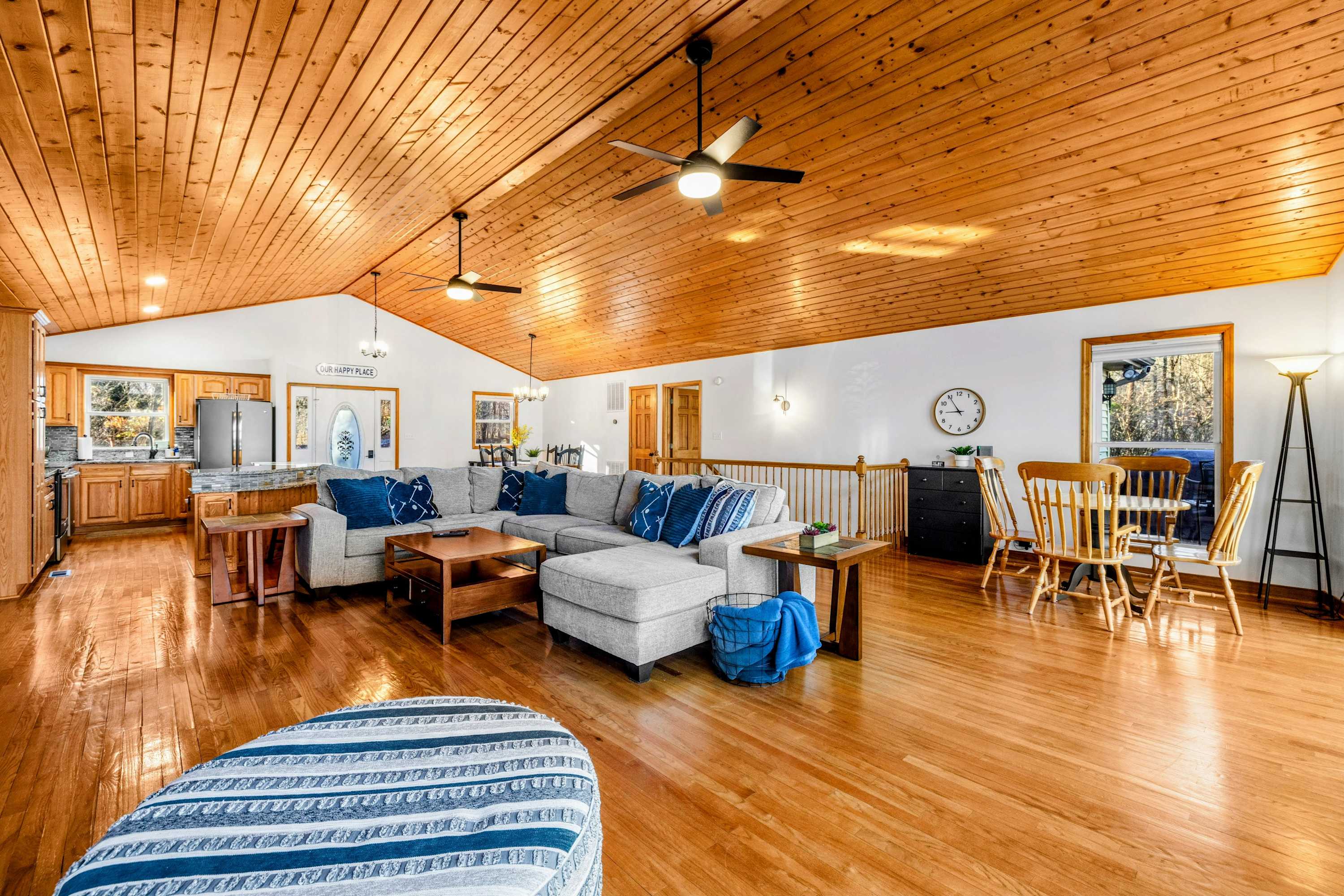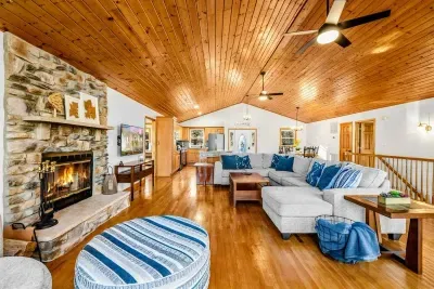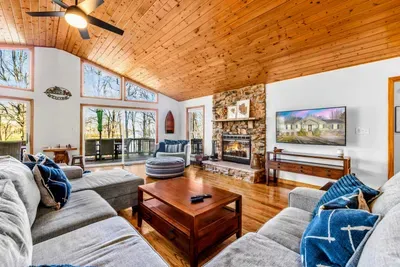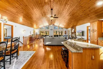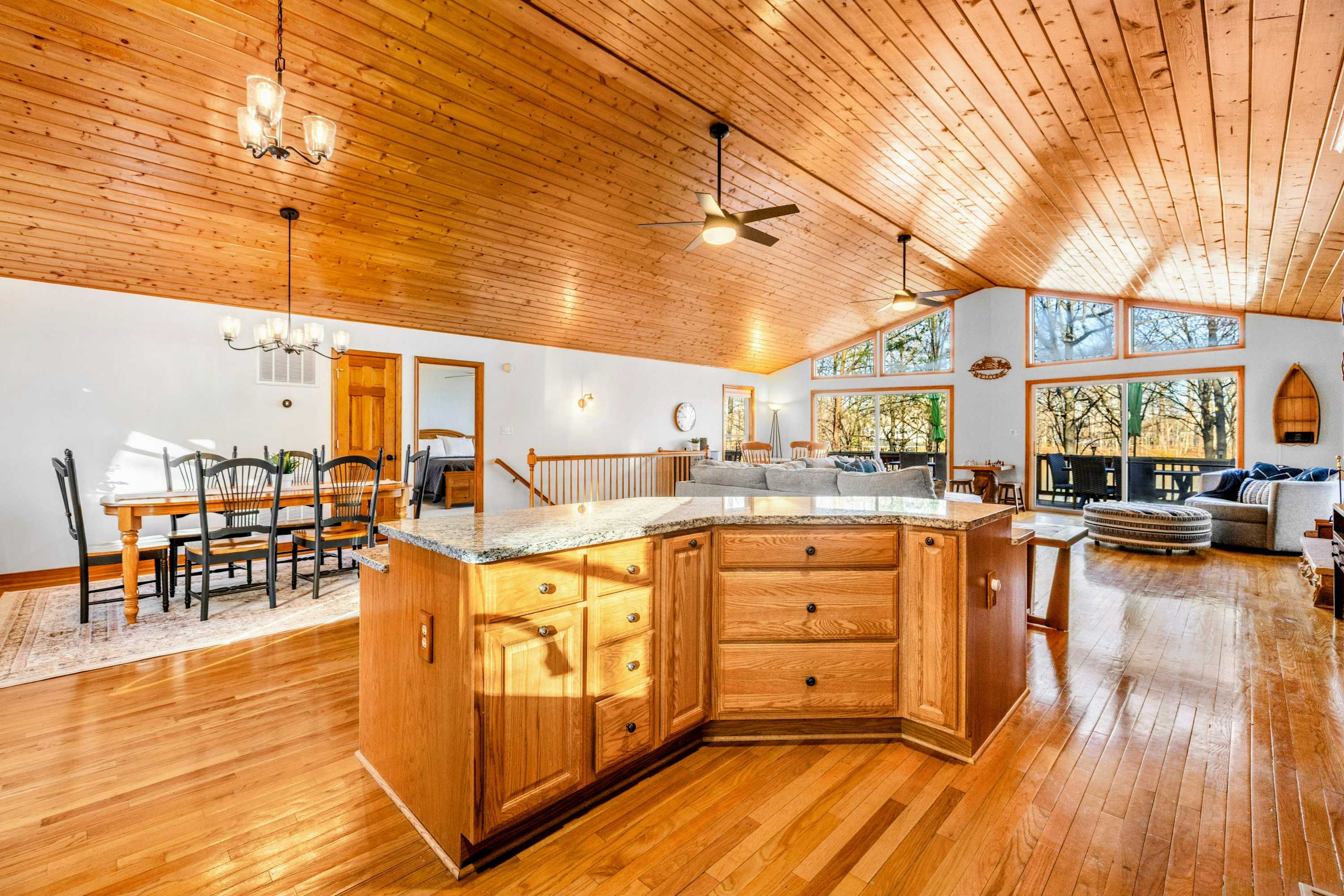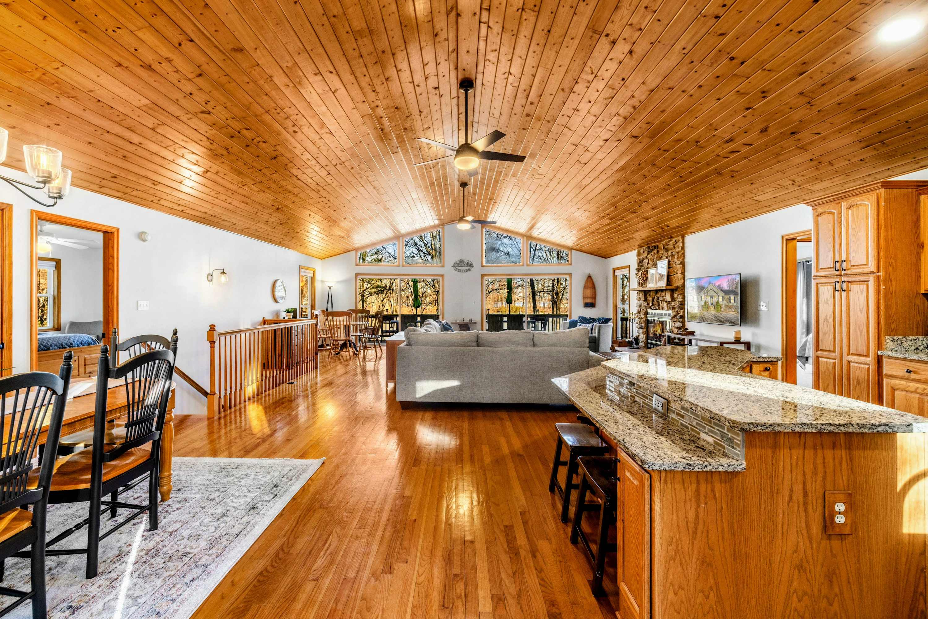 Peaceful Haven spans two spacious levels designed for comfort and style. On the main floor, you’ll find an open-concept great room with soaring vaulted wood ceilings, hardwood floors, and floor-to-ceiling windows that frame stunning lake views. The fully equipped kitchen features granite countertops, stainless-steel appliances, and a center island perfect for easy meal prep and entertaining.