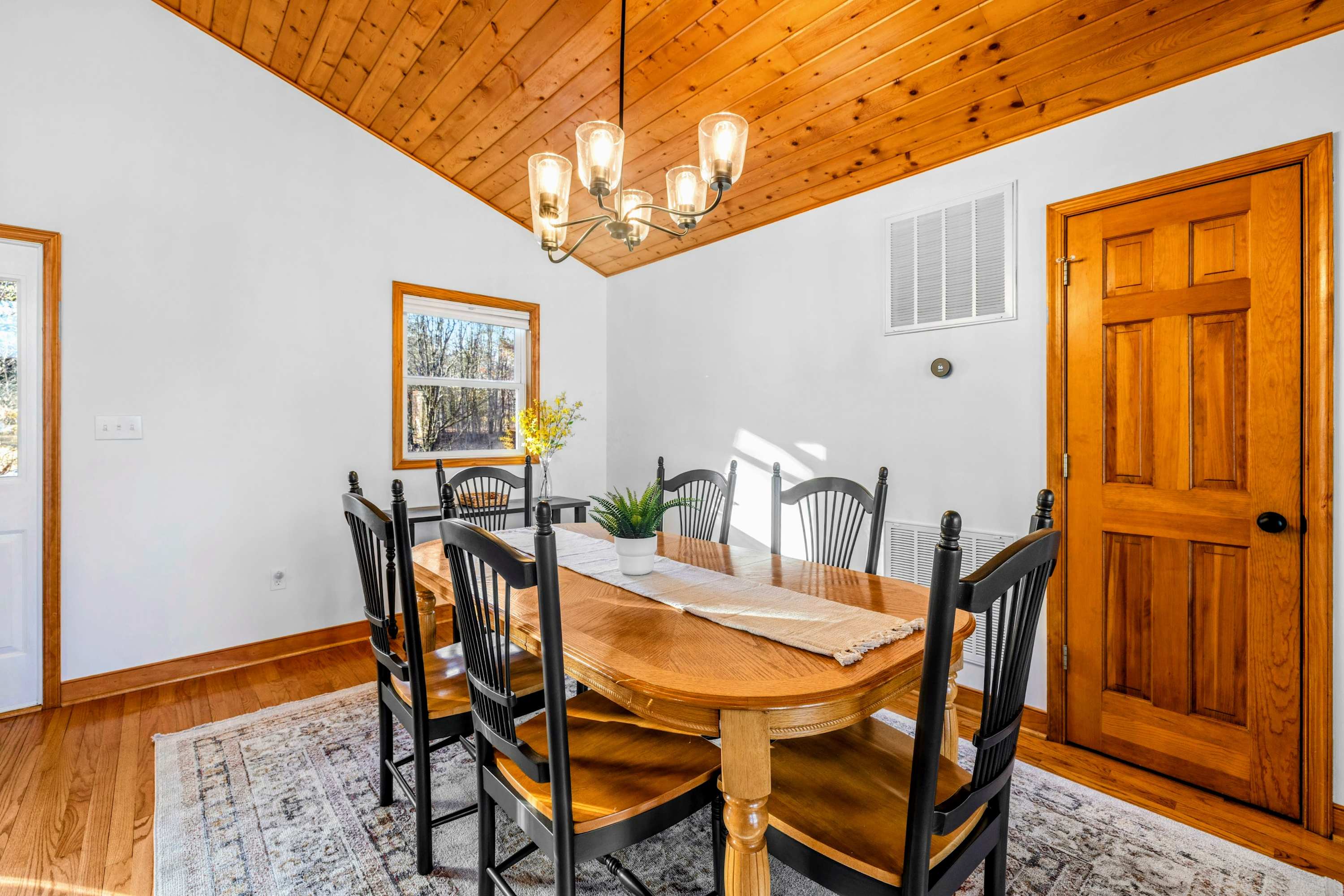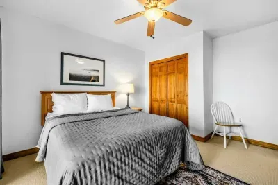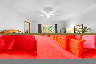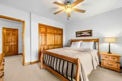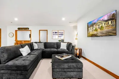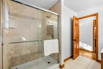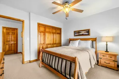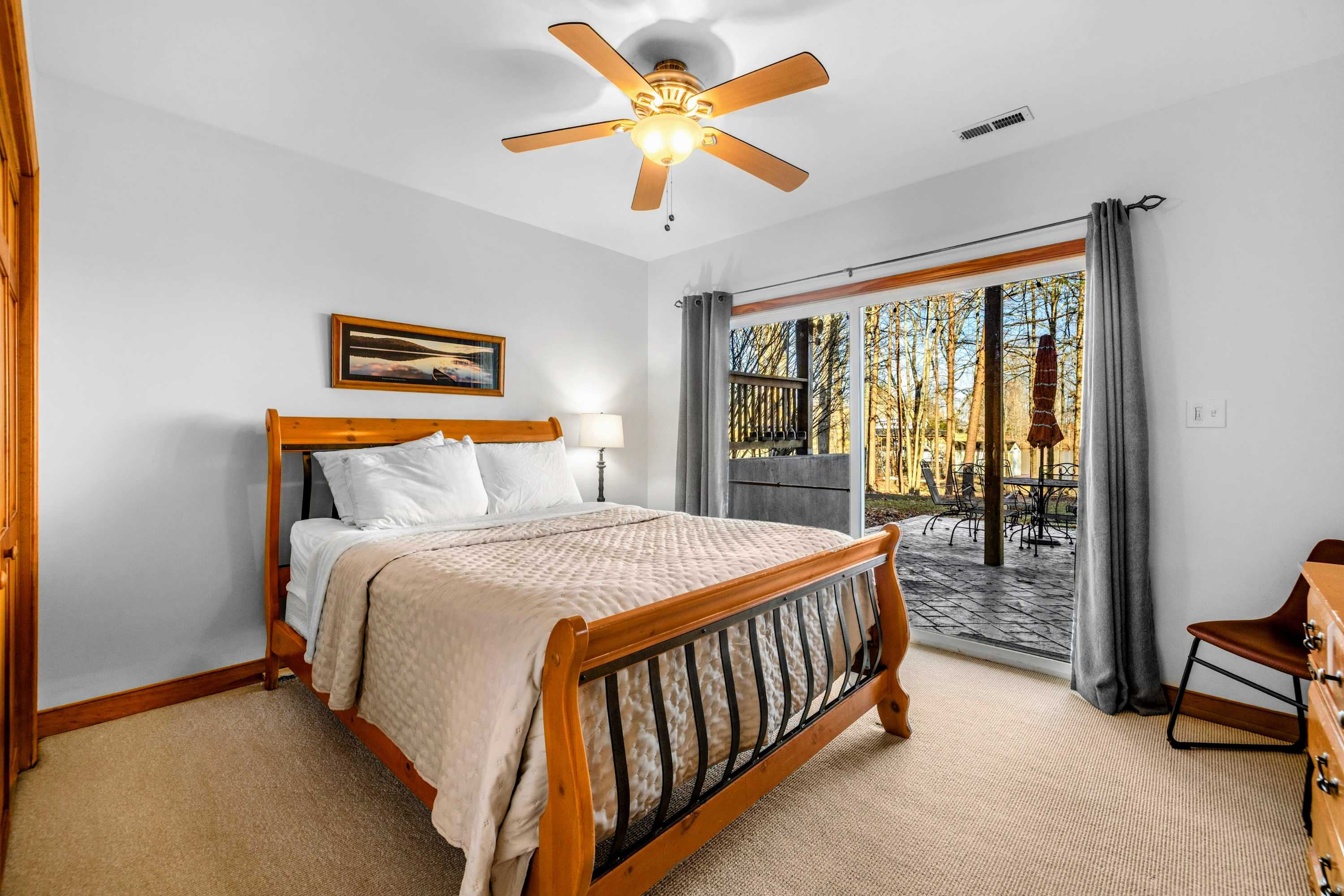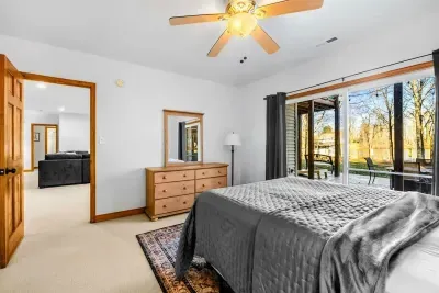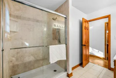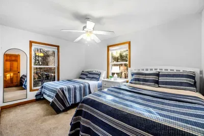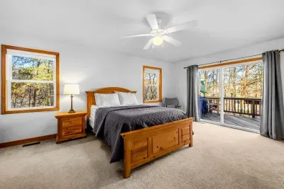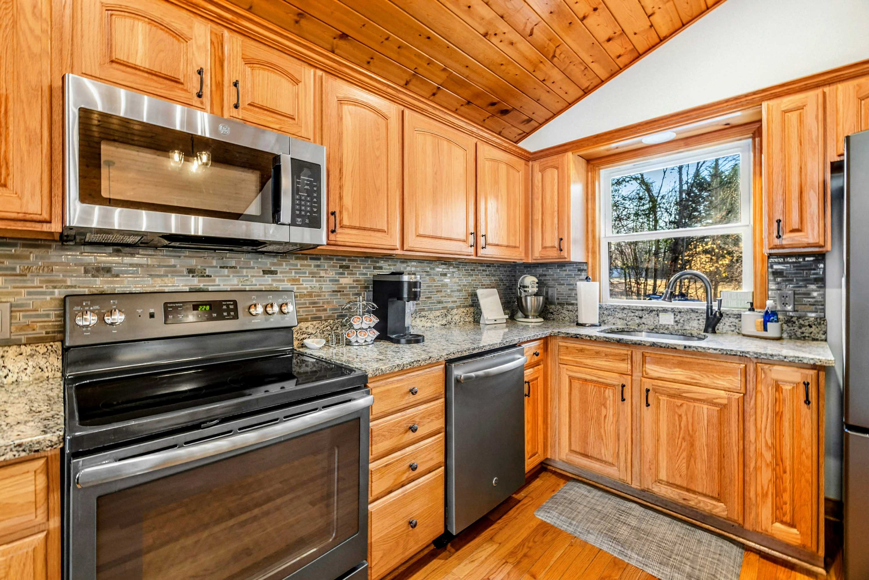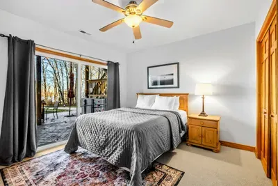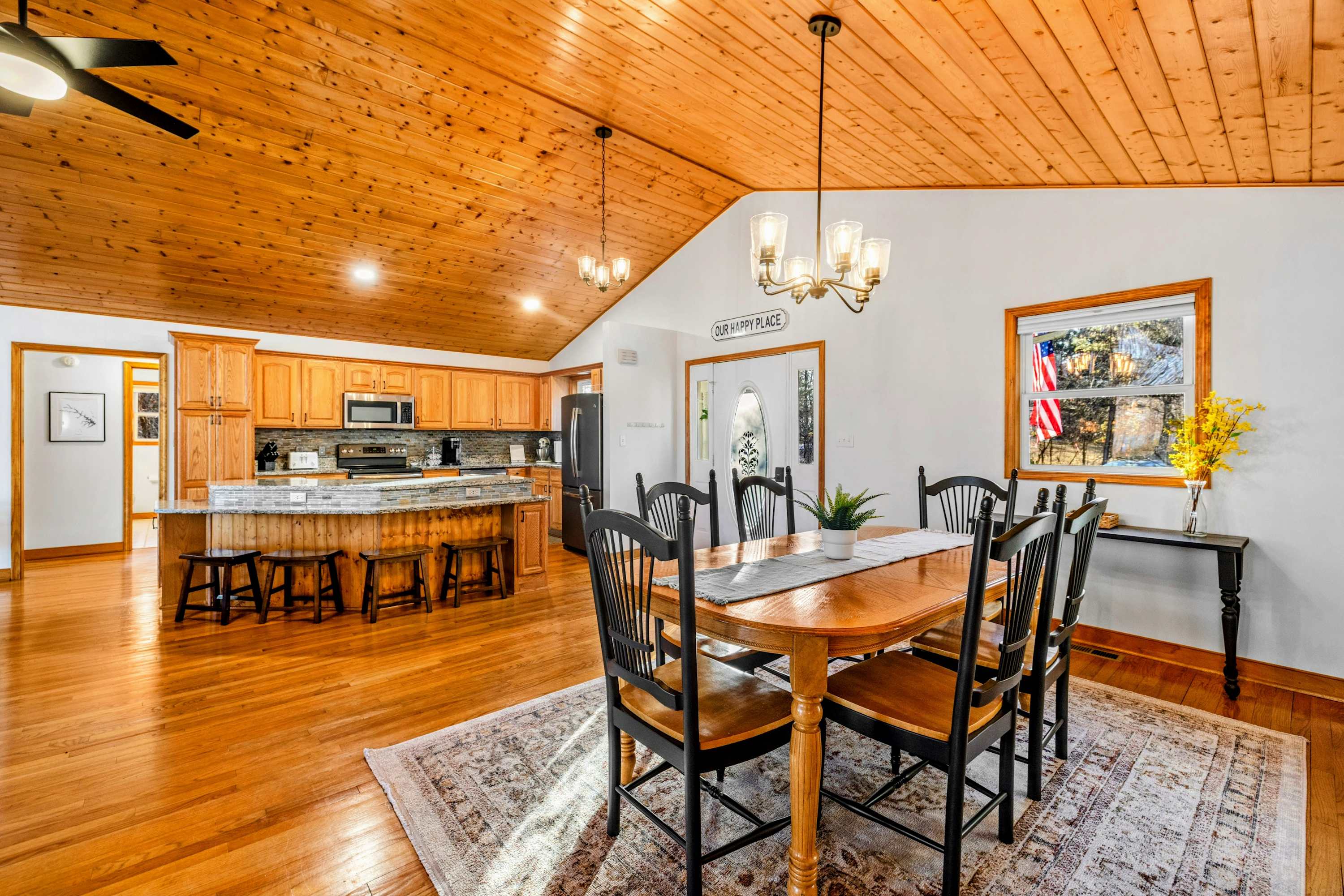 Peaceful Haven spans two spacious levels designed for comfort and style. On the main floor, you’ll find an open-concept great room with soaring vaulted wood ceilings, hardwood floors, and floor-to-ceiling windows that frame stunning lake views. The fully equipped kitchen features granite countertops, stainless-steel appliances, and a center island perfect for easy meal prep and entertaining.