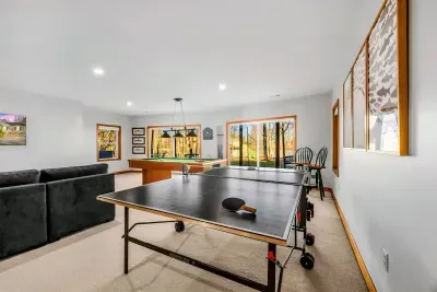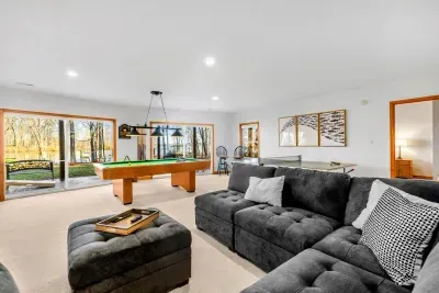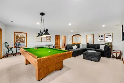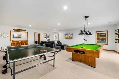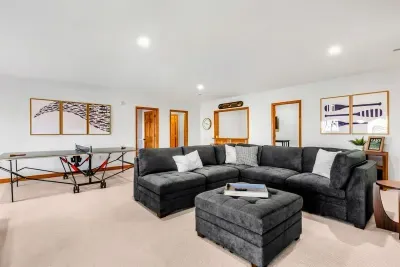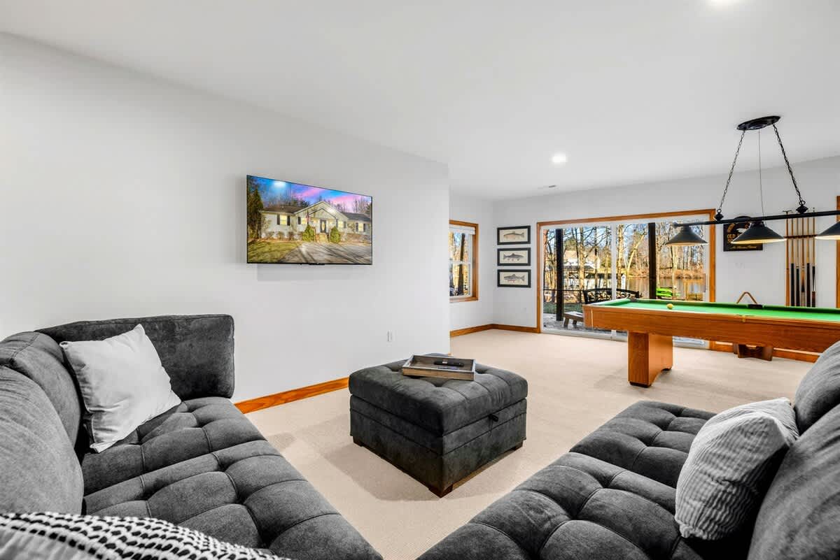 The main floor also features a lakeside primary suite with deck access, a walk-in closet, and a spa-inspired en suite bath. Two additional bedrooms and a full bathroom provide ample comfort for family and friends. Downstairs, the walkout basement includes a spacious game room and two more bedrooms with two full bathrooms, offering extra space to spread out and unwind.
