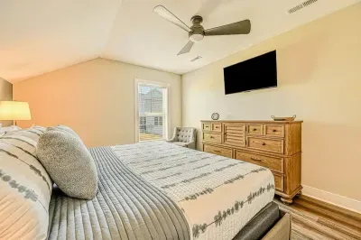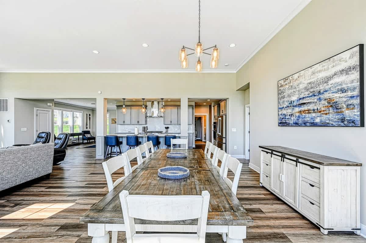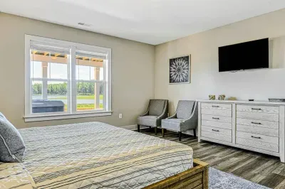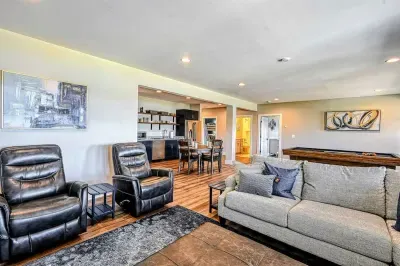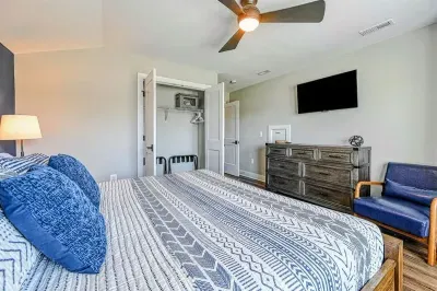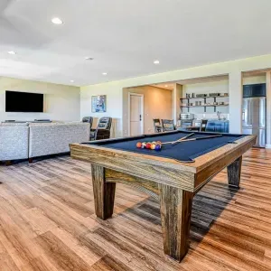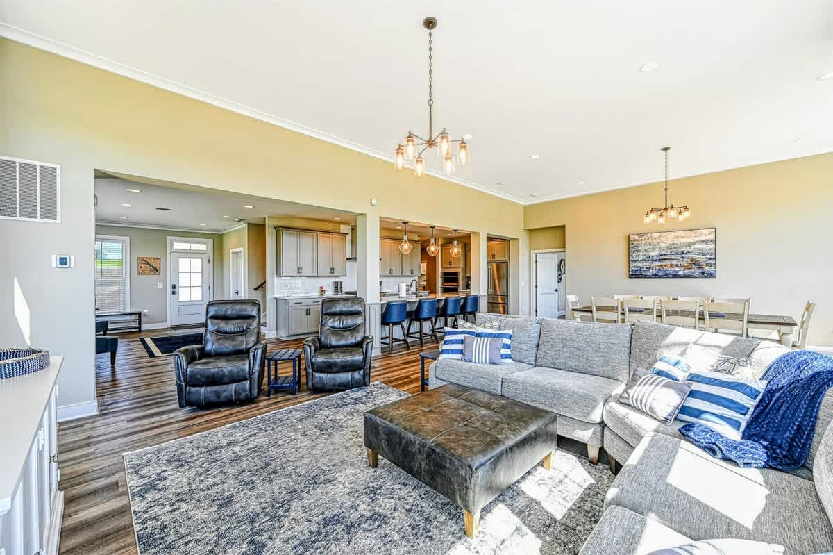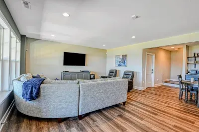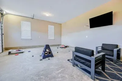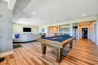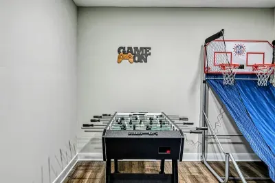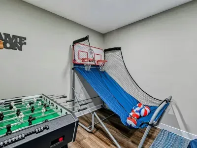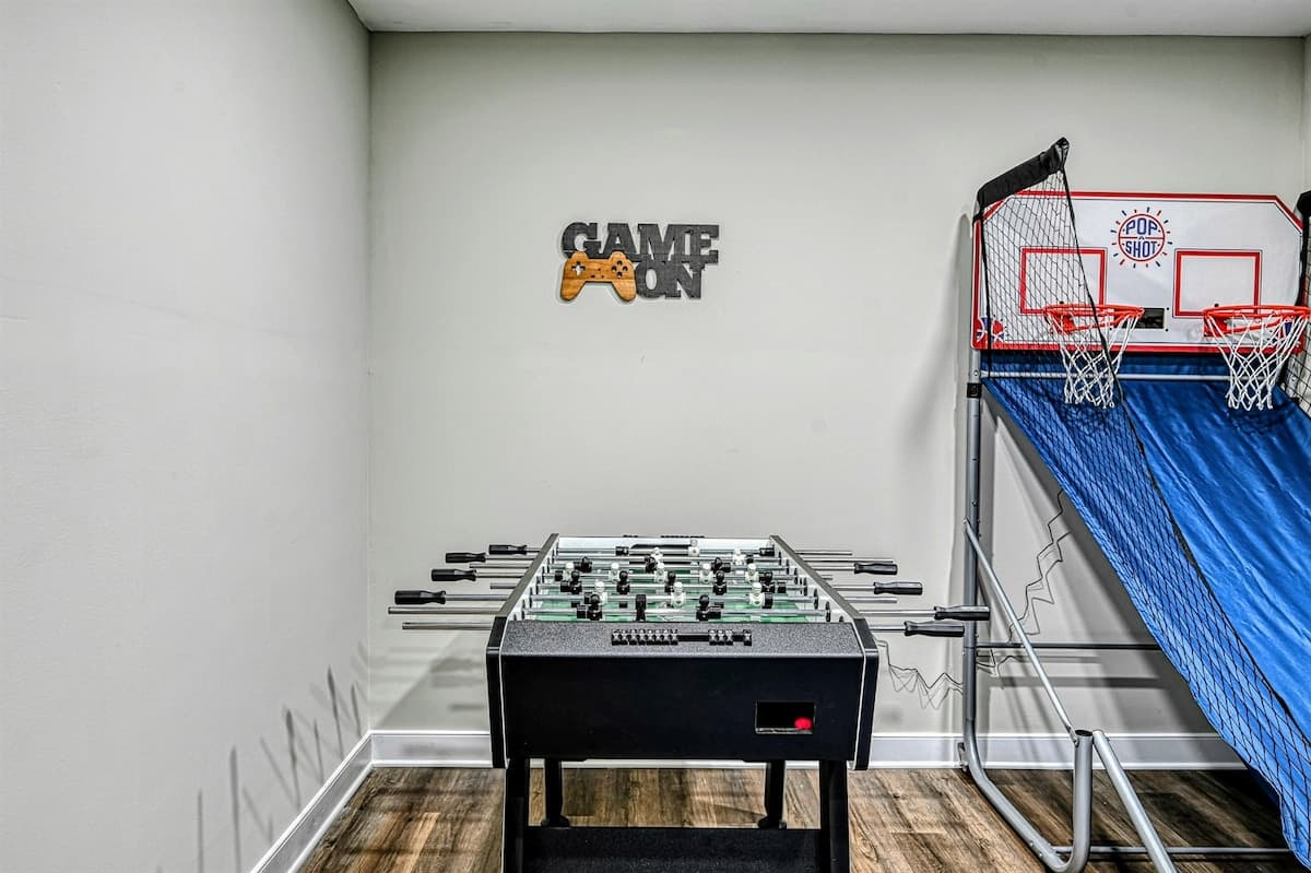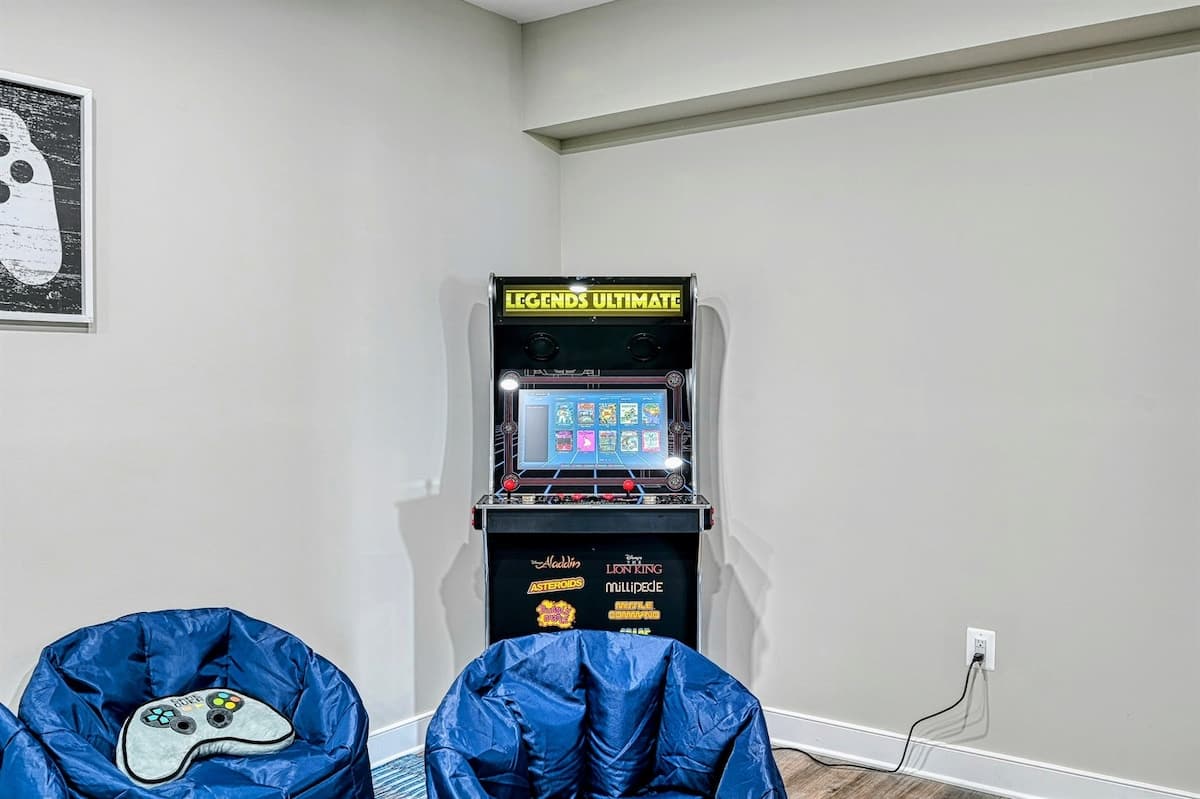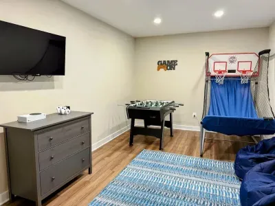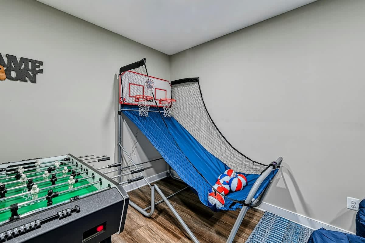The expansive home accommodates up to 18 guests with 7 bedrooms, 5 bathrooms, and an open floor plan, making it ideal for family gatherings or reunions. Relax in the spacious great room with large windows, comfortable seating, and a 4K Smart TV, or have fun in the lower-level game room equipped with an arcade game, Xbox, basketball hoop, pool table, ping-pong, foosball, and family games. High-speed internet and a dedicated workspace make remote work easy, while the Wi-Fi throughout the home allows you to stream your favorite shows.