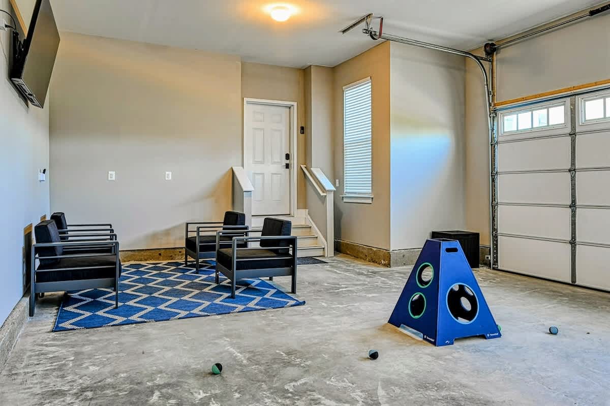 For entertainment, the lake level includes two game areas with a pool table, foosball, basketball, video arcade, Xbox, and karaoke machine, leading to the hot tub and covered seating area. The finished garage is a gamer’s paradise with ping pong, cornhole, and a television, creating a sports fan's dream space.