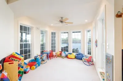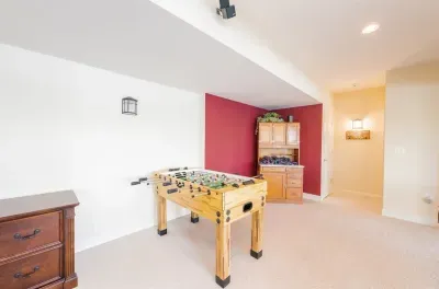The lower level: holds 4 bedrooms. The one master as well as 2 other queen bedrooms have gorgeous lake views! There is also a fun, animal themed bunk room on this level that is perfect for kids. Down here you will also find a cozy living area with TV, and an adult game room (with a pool table & foosball).