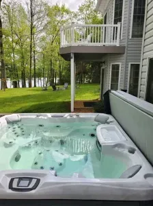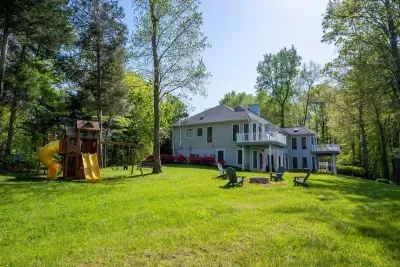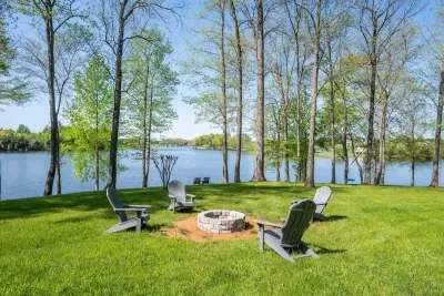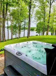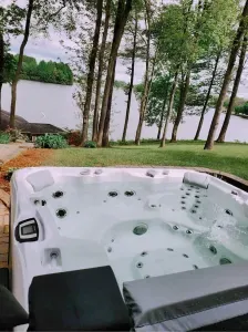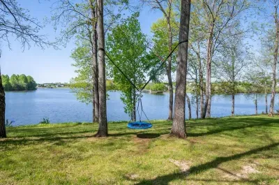 The backyard: Sprawling waterfront property offering ample lawn space, a large hot tub, fire pit & playground (swing set, 2 slides, rock climbing wall). Multiple swimming docks, ideal for sunbathing, and most importantly, a perfectly safe, no wake area for swimming! There is also a fenced in area for pets (that you can access from the main level of the home). We offer a propane grill and a Blackstone flattop for your use!