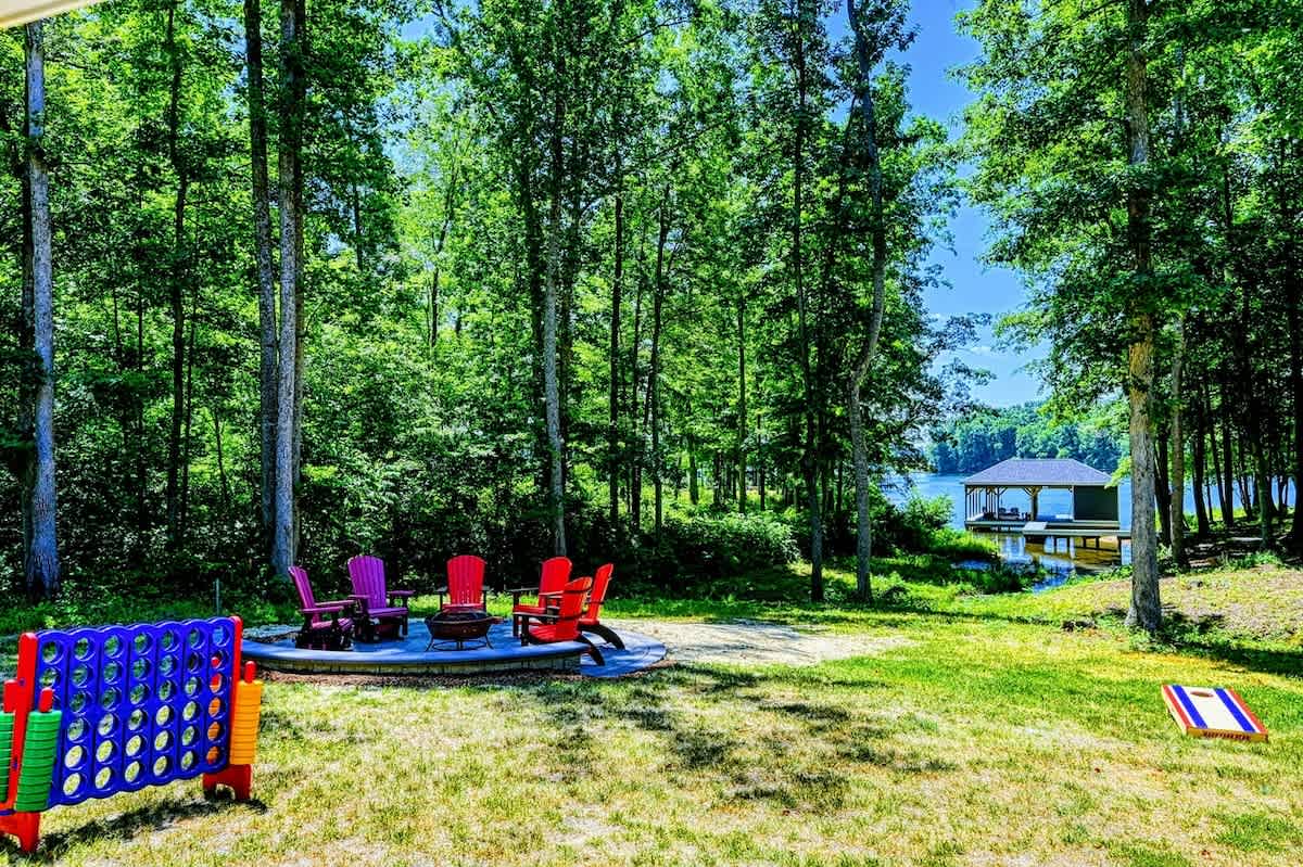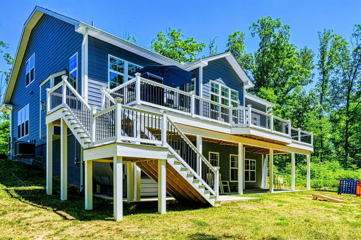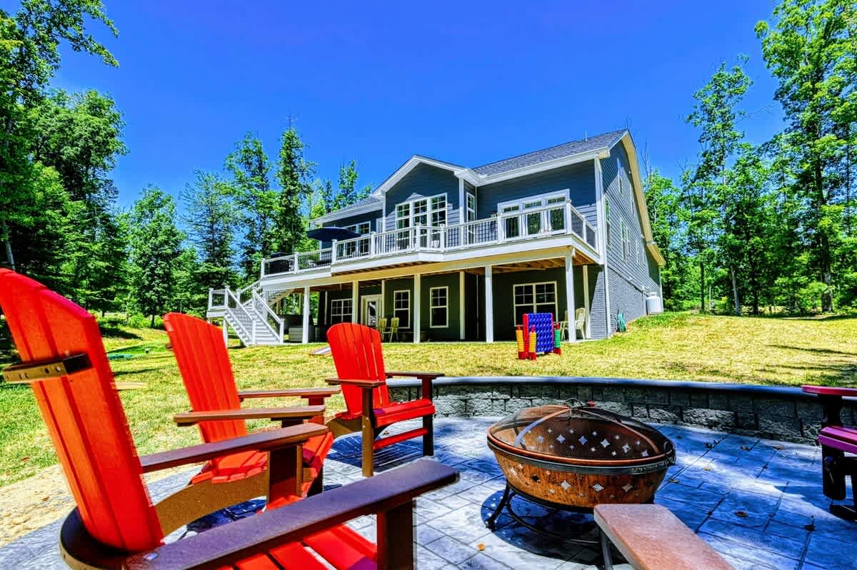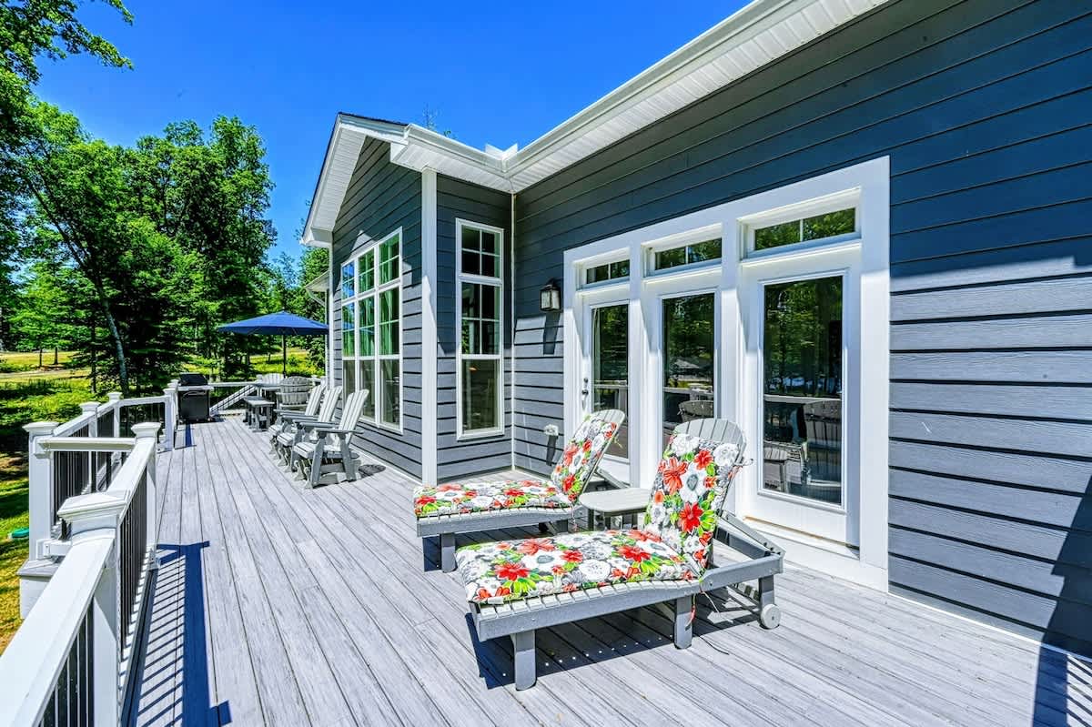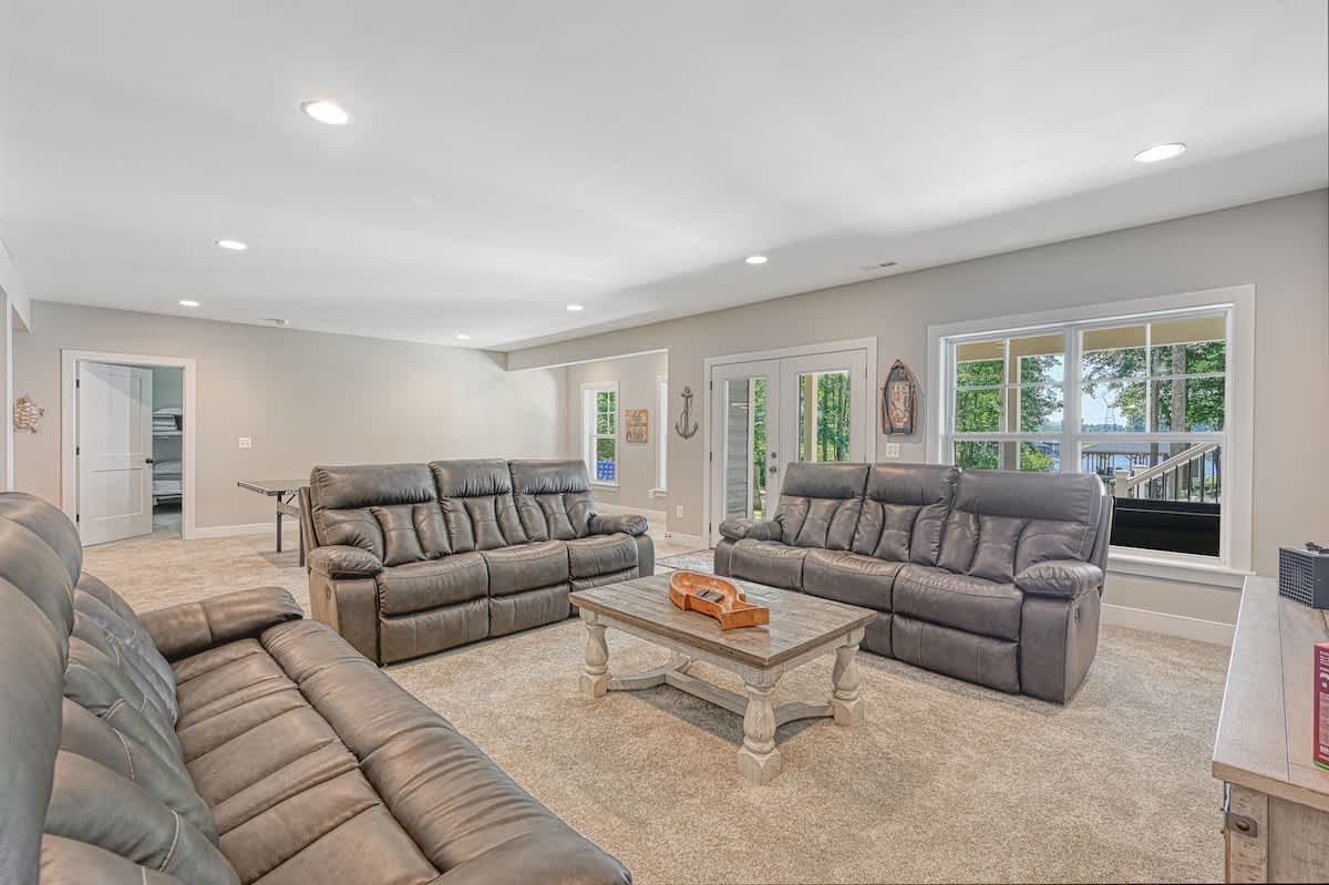 Experience comfort and luxury at our brand new and spacious lakefront home on the Private Side of Lake Anna. This beautiful home is located on a partially shaded lot in a cove with part of the boat house covered and part open to the sun. You can swim, explore with 2 kayaks, lay out on the dock's open deck area, or simply relax on the covered lounge area, enjoying the serene view of the beautiful lake! Roast some delicious s'mores outside using our outdoor fire pit, or have a BBQ using our grill on the deck. Enjoy the blue water views from atop of our massive deck. We have an open floor plan and offer 3 living areas including the main great room with a gas fireplace, a lower level game room with ping pong table, and games, and an open upper level loft area with a Smart TV and family appropriate games. Relax in the spacious main great room with water views through the huge bright windows, a gas fireplace, and 4K Smart TV. Use the High Speed Internet and free Wi-Fi network to stream your favorite shows while you FaceTime everyone! The home easily sleeps 16 with 5 bedrooms, and 4 bathrooms. Each of the 4 King bedrooms have their own TV. The main floor has an open floor plan with a great room and adjacent large kitchen, pantry, primary suite (King bed), second bedroom (King bed), and laundry room. The lower level has the game room, and bunk room suite (4 Twin over Twin Bunk beds). The upper level has a spacious loft area with TV, and 2 additional bedrooms including Jack (King bed) & Jill (King bed) style bedrooms with a shared full bath in between them.