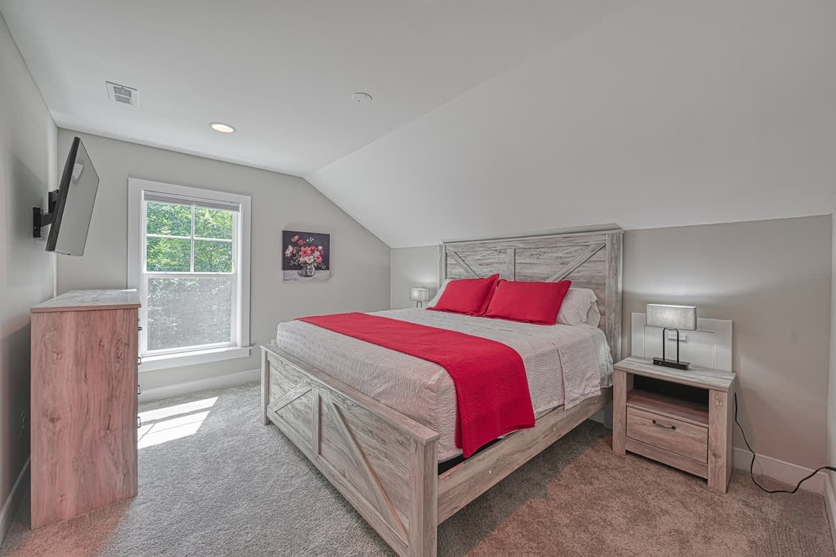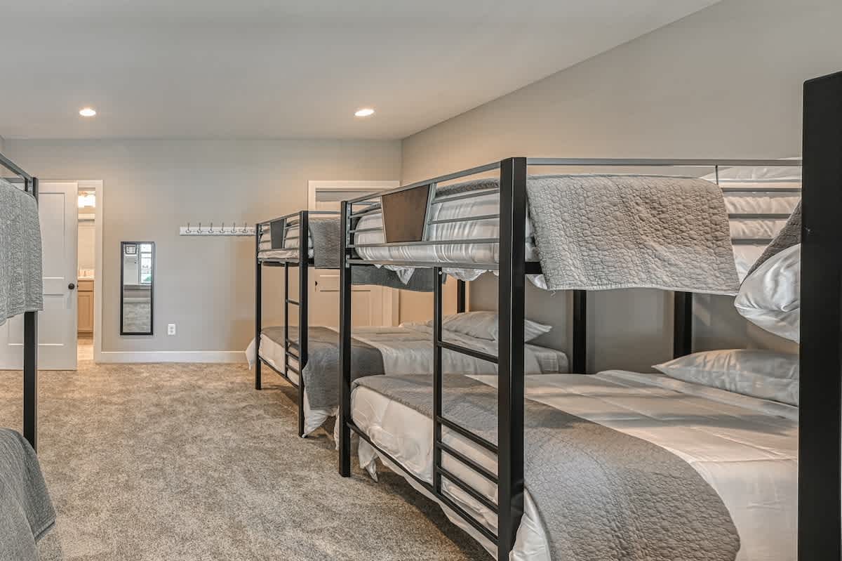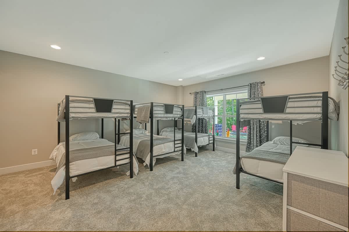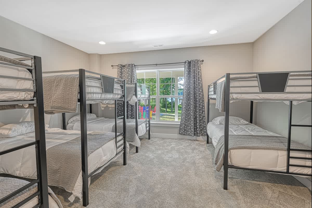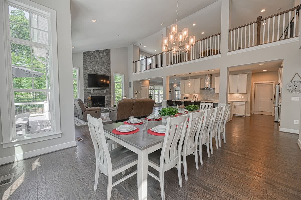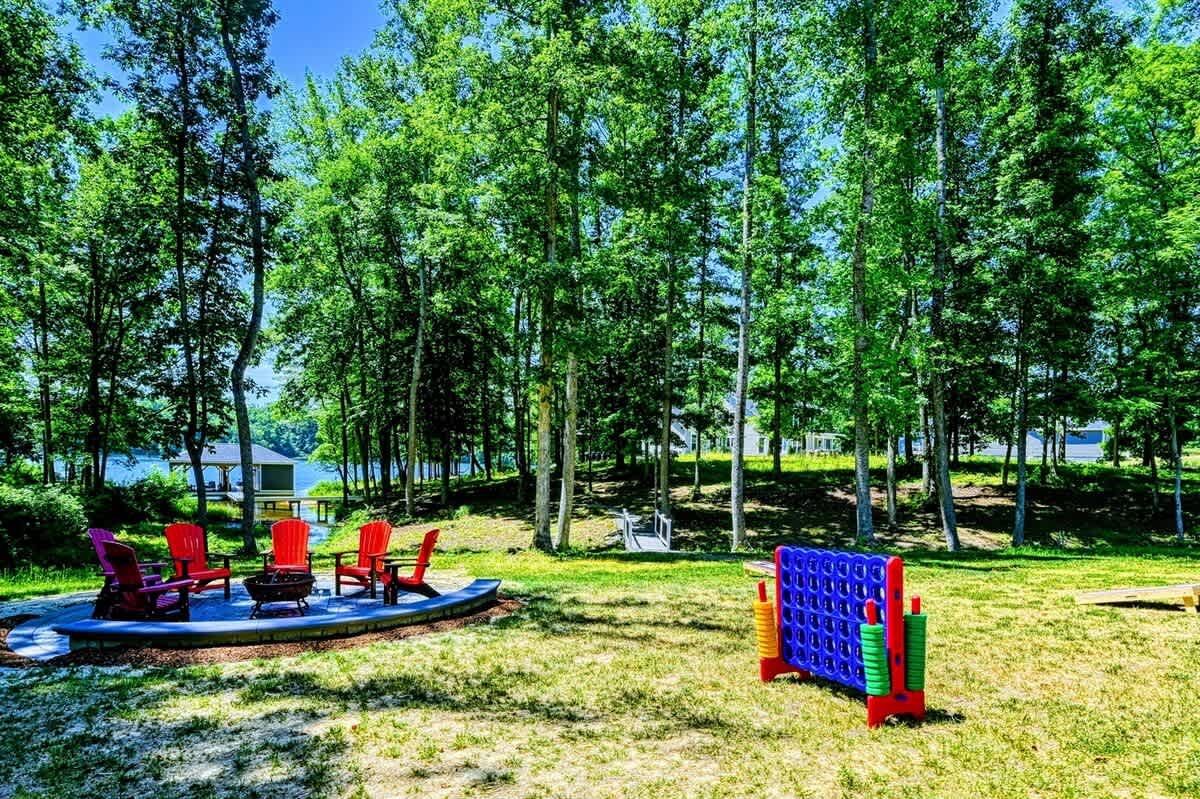 Experience comfort and luxury at our brand new and spacious lakefront home on the Private Side of Lake Anna. This beautiful home is located on a partially shaded lot in a cove with part of the boat house covered and part open to the sun. You can swim, explore with 2 kayaks, lay out on the dock's open deck area, or simply relax on the covered lounge area, enjoying the serene view of the beautiful lake! Roast some delicious s'mores outside using our outdoor fire pit, or have a BBQ using our grill on the deck. Enjoy the blue water views from atop of our massive deck. We have an open floor plan and offer 3 living areas including the main great room with a gas fireplace, a lower level game room with ping pong table, and games, and an open upper level loft area with a Smart TV and family appropriate games. Relax in the spacious main great room with water views through the huge bright windows, a gas fireplace, and 4K Smart TV. Use the High Speed Internet and free Wi-Fi network to stream your favorite shows while you FaceTime everyone! The home easily sleeps 16 with 5 bedrooms, and 4 bathrooms. Each of the 4 King bedrooms have their own TV. The main floor has an open floor plan with a great room and adjacent large kitchen, pantry, primary suite (King bed), second bedroom (King bed), and laundry room. The lower level has the game room, and bunk room suite (4 Twin over Twin Bunk beds). The upper level has a spacious loft area with TV, and 2 additional bedrooms including Jack (King bed) & Jill (King bed) style bedrooms with a shared full bath in between them.