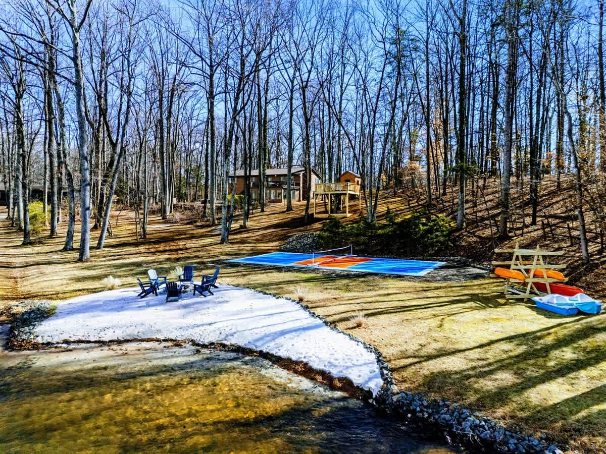 - Lakeside pickleball court and a rustic treehouse for family fun.