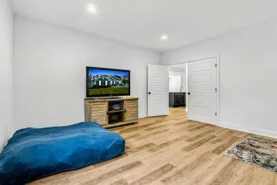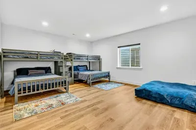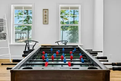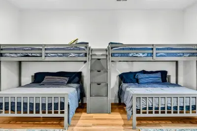 The lower level is the walk-out level to the lake. This level has a second utility kitchen with refrigerator, sink and dishwasher. The walk-out level also has the second primary bedroom, a bunk room that can sleep 4-6 comfortably, a large sectional for TV viewing and foosball table.